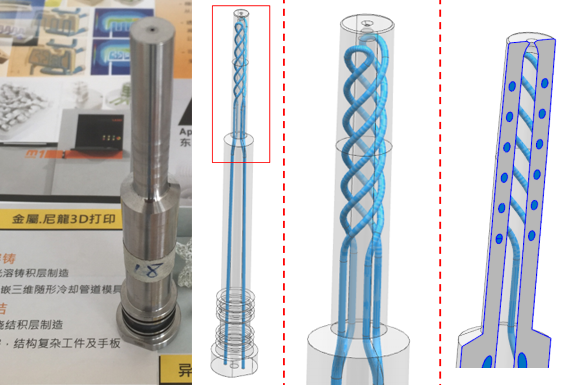 模具簡述: 模具共3個工件使用增材制造技術成型:上內模、下內模、尖點熱唧嘴套 材質:1.2709 硬度:上內模、熱唧嘴套 HRC52,下內模 HRC50 型芯表面:火花紋效果